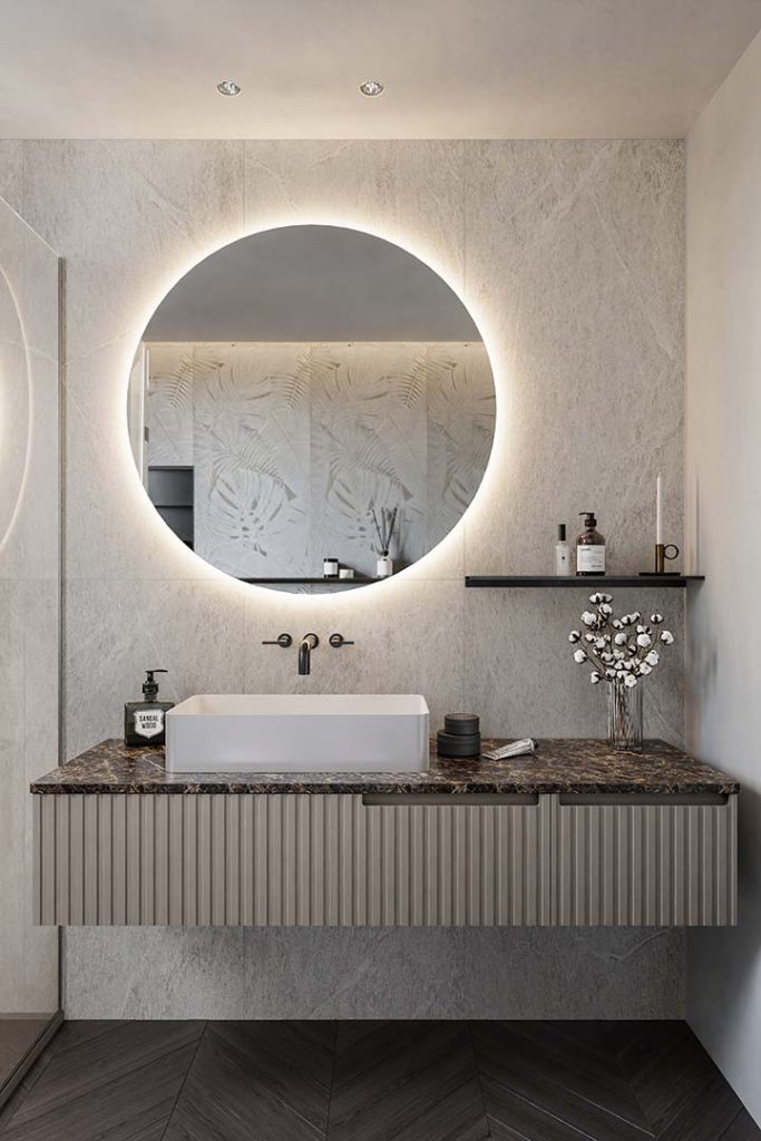 Despite its compact dimensions, the effect is significant and prestigious. The shower area deserves special mention due to its width and its original and creative position.