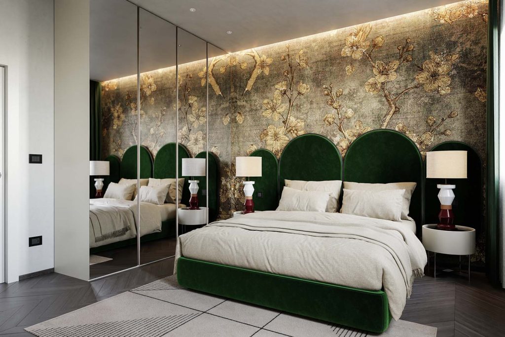 The main bedroom, with the large velvet bed, was inspired by a luxurious hotel bedroom. The bathroom is a natural environment where attention to detail is reflected in the choice of exclusive products, from Gessi taps to third-firing tiles with a particular effect of open pores.