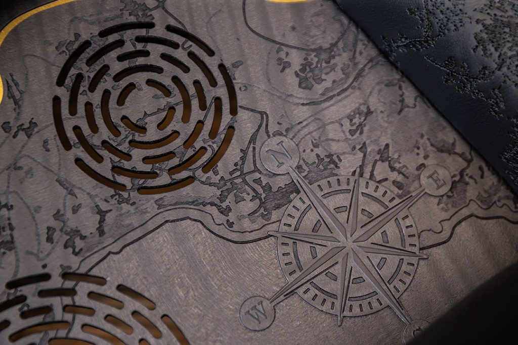 - Laser-etched motifs – Maps, trees, landscapes, and flowers etched at three different depths, creating tonal contrasts that give the panels movement.
