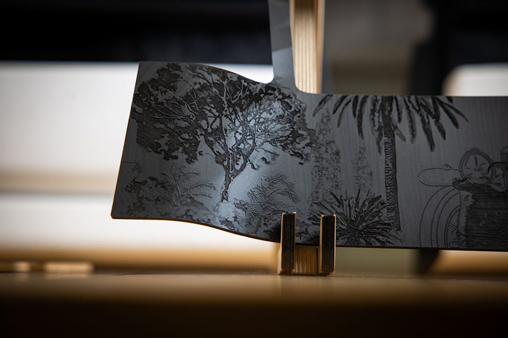 - 3D marquetry – Raised elements, engraved and layered, add tactile intrigue to the composition, allowing history to be felt as much as seen.
